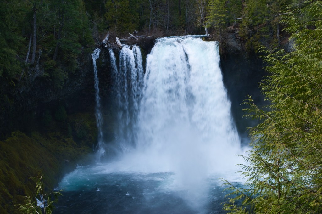 On my return trip home a few hours later I stopped off at Sahalie falls again. The sun had moved further west, and this area is in shadow. It would have been harder to see in those shadows with the regular program, and I am always trying to capture the turquoise color that seems to move through the water as it falls down to the base. Success. after this shot I backtracked about a mile or so and stopped at Koosah Falls which is below Sahalie.