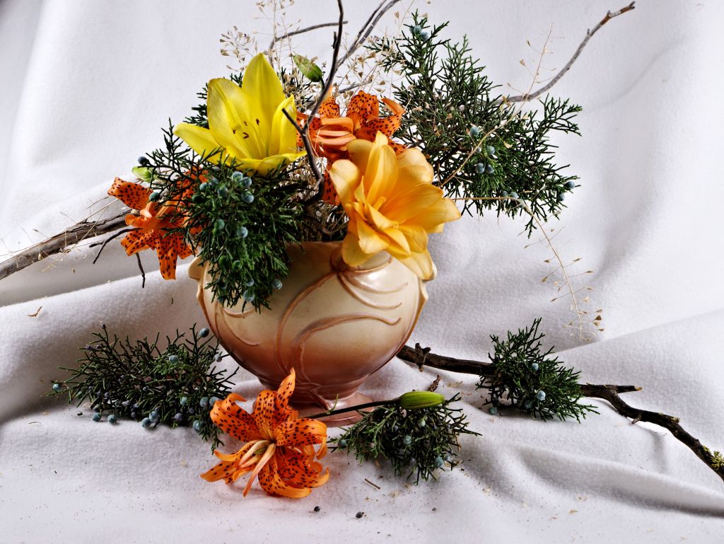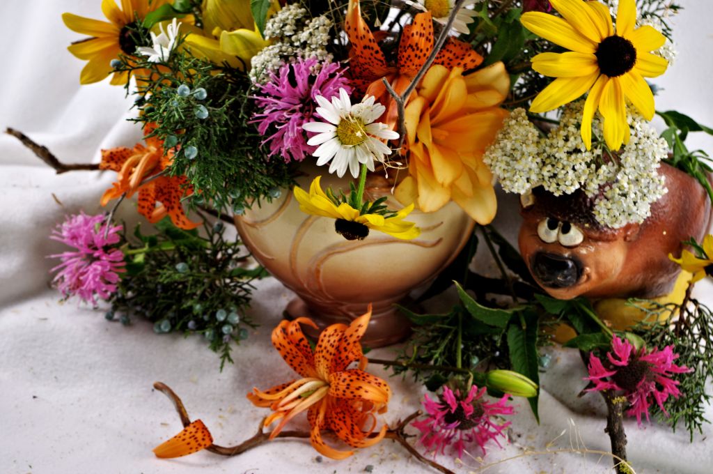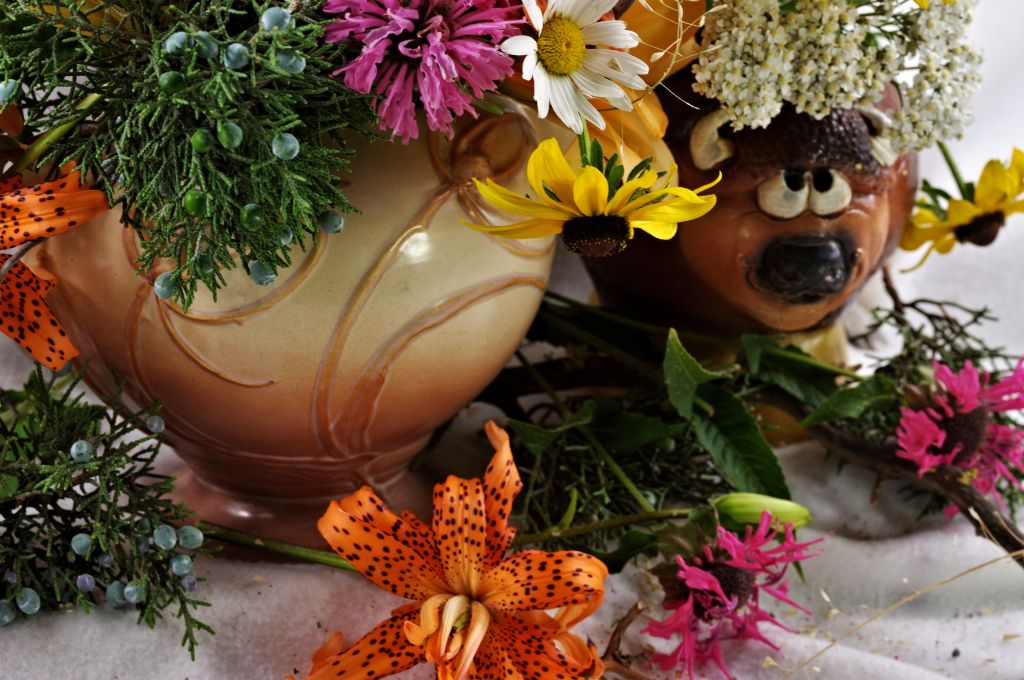 So my photo Challenge was to take a Roseville vase I bought last fall in a thrift store combine the juniper clippings, the seed heads, with some of the oriental and tiger lilies that have been blooming. The first photograph was the result of that challenge. I like it. But is that it ??? Well No… I had also collected yarrow, bee balm, daises and I had been photographing for a little over 3 hours with all of the different flowers and various containers. The challenge was saved for last and when I got the shot I envisioned, I then started adding the other flowers to the mix. I really don’t know how Mylo the fluffy cow, got into the photo