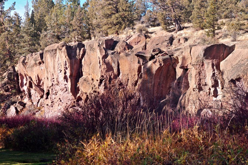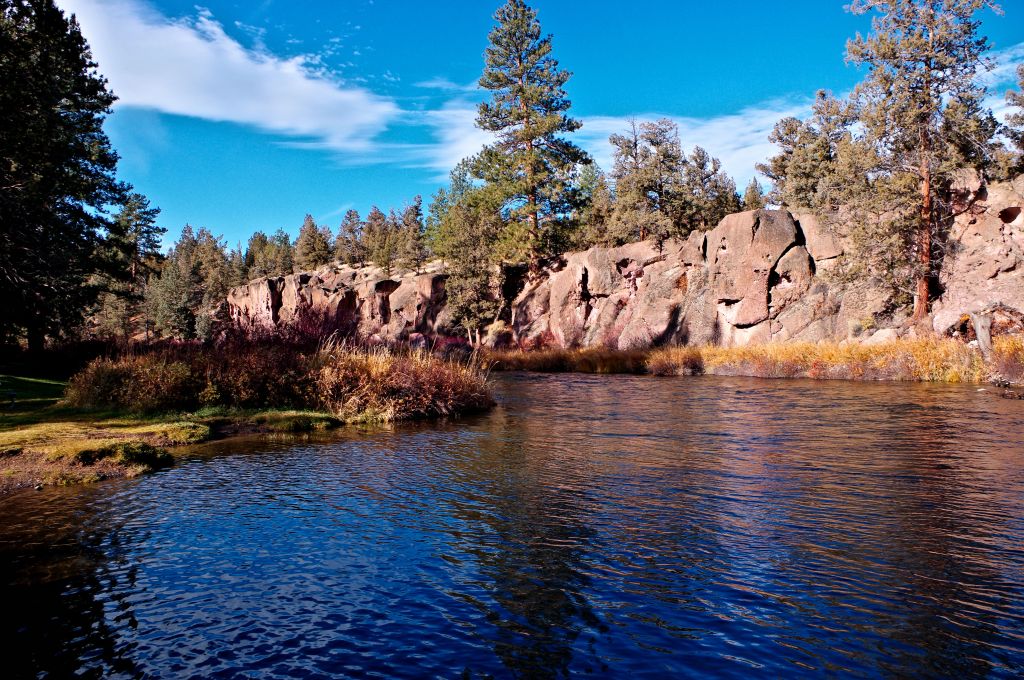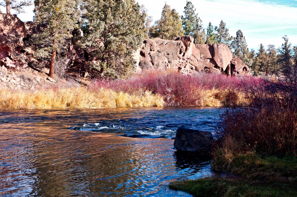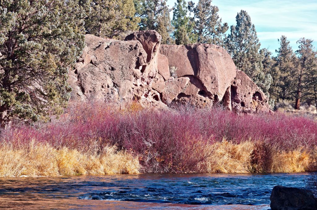 And this morning was fantastic. Now that we are in fall there was the red willow branches, the yellow of the dried grasses, the green of the junipers and ponderosa pines, the deep blue of the river water against the pink pumice rocks, and the reflections of the rocks on the water.