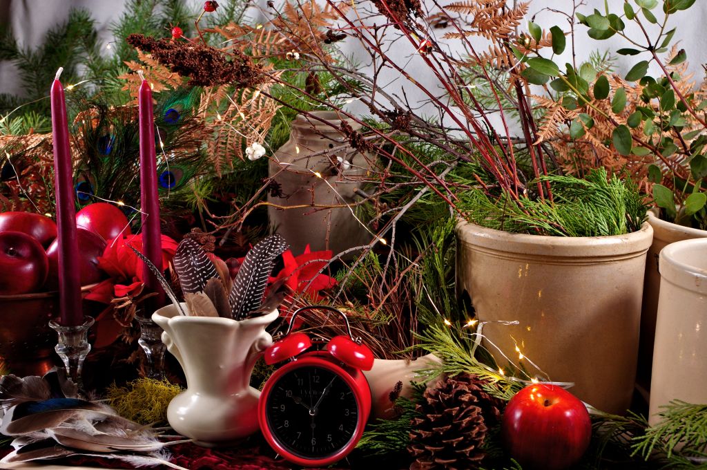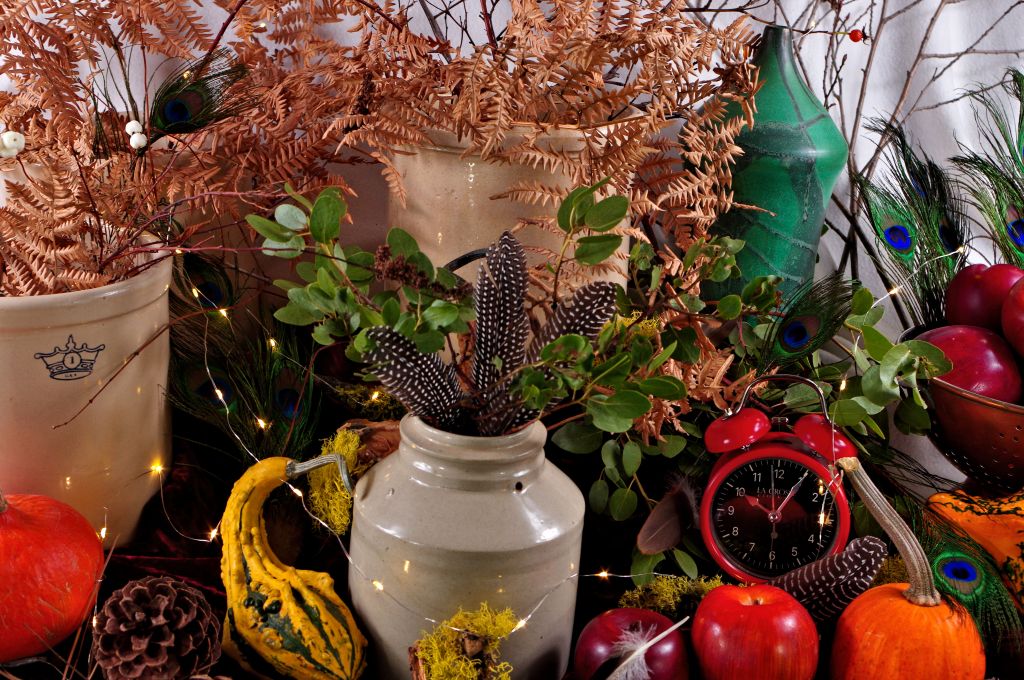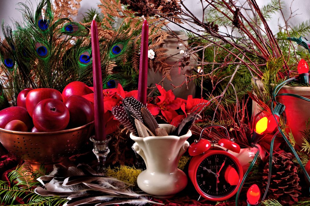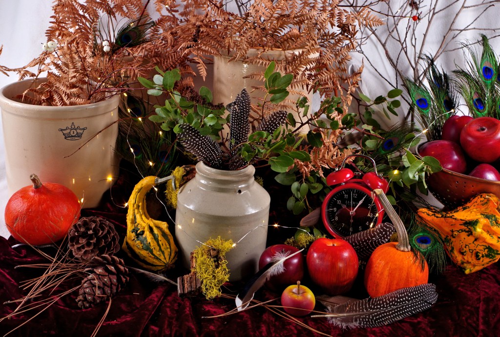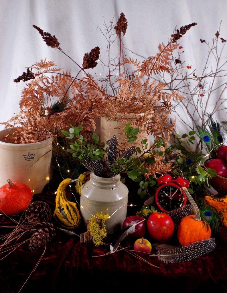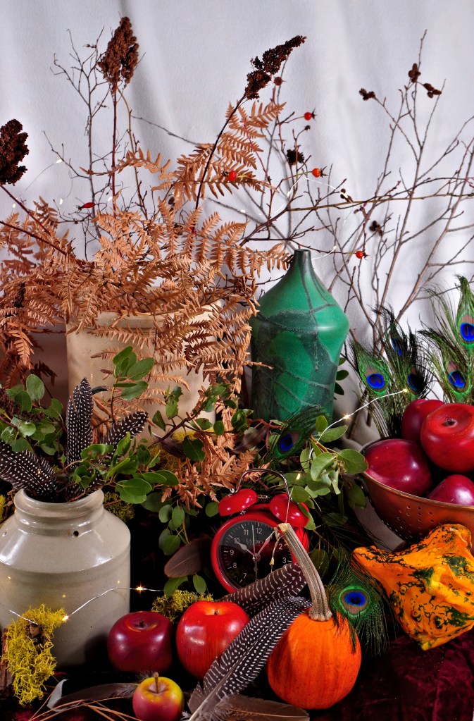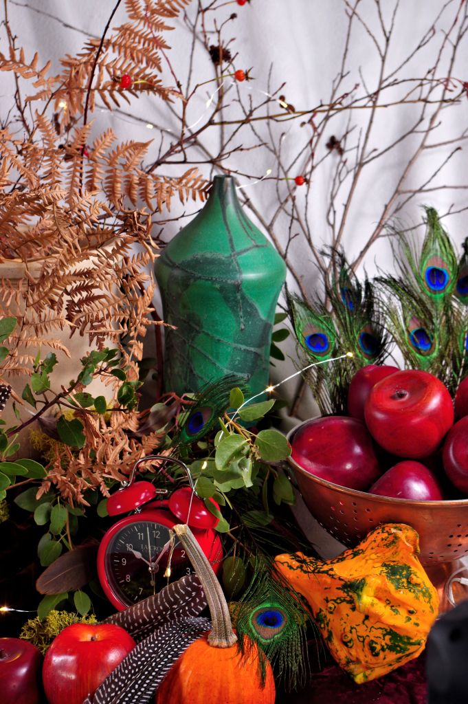 Add the red velvet cloth, the fake and wooden apples and the feathers.